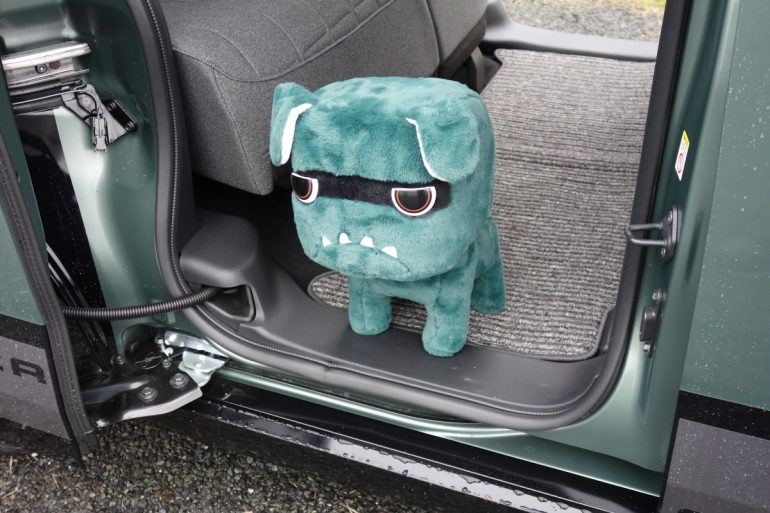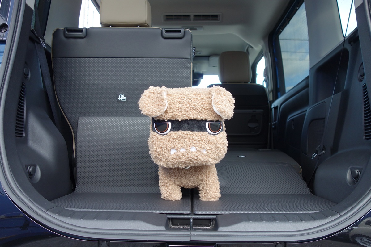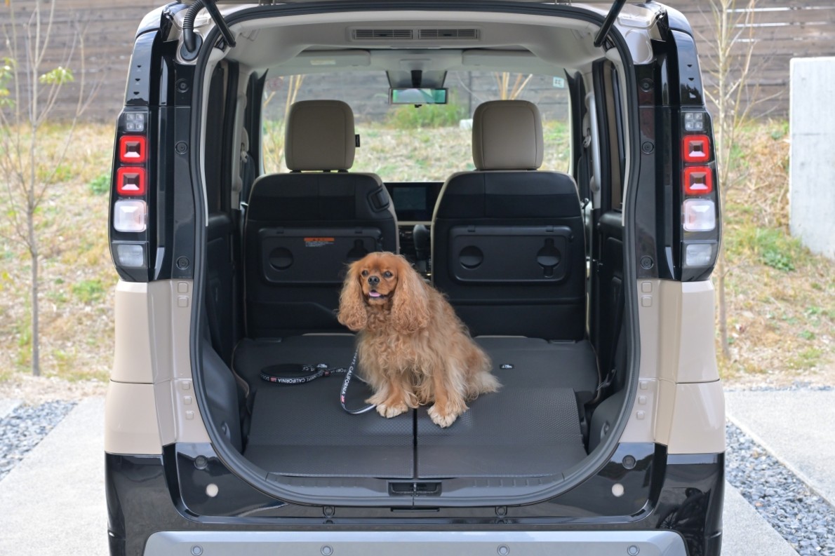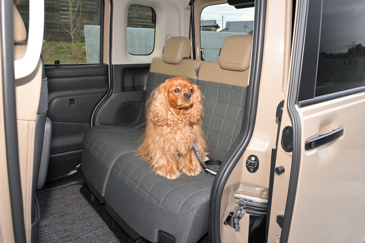 愛犬の特等席となる後席の乗り降りのしやすさは、中型犬のアーモンドでも文句なし。何しろ大開口スライドドアから乗り降りする際のステップ地上高は2WDで370mm、4WDでも400mm。無理なく、サッと自身で後席フロアに乗り込むことができて、安全に降りることができるんだ。フロアから後席シート座面のまだの高さも実測で約380mmだから、シートに飛び乗ることも容易わん。