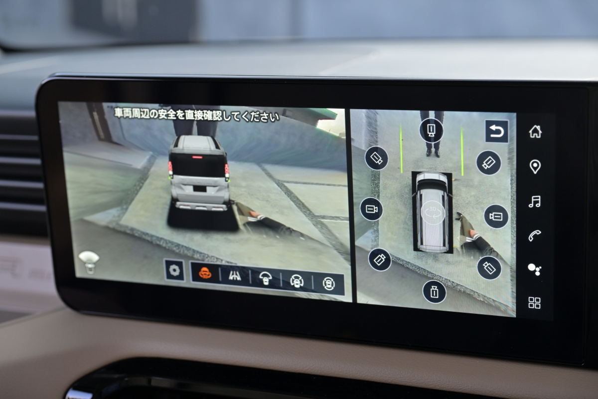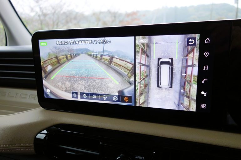 3Dマルチアラウンドビューモニターは、出発前にクルマの回りにいる家族や愛犬が3D画像で一目瞭然。これは大きな安心・安全わん。さらに、画期的なフロントアンダーフロアビュー(フロント透過ビュー)は駐車時や凸凹のある悪路路面での運転の負担を軽減してくれる神機能。新型デリカミニのオールラウンド性能にさらなる安心・安全を付け加えてくれるんだ。