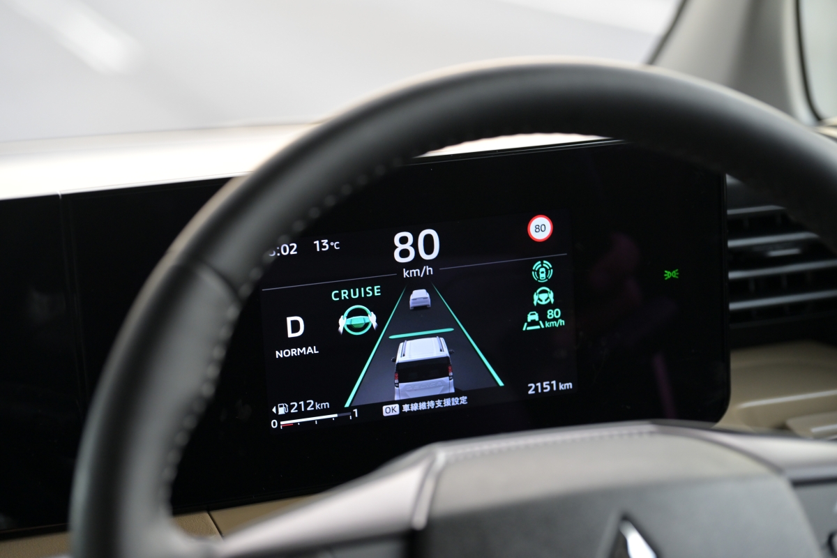 帰路の高速道路では、運転支援機能の三菱e-Assistと高速道路同一車線運転支援機能のMI-PILOT(マイ・パイロット)の実力、ありがたみを実体験(Premiumグレード)。レーダークルーズコントロール(ACC)と車線維持支援機能(LKA)の2つの機能で、ペダル操作なしで前のクルマとの距離を保ち、車線中央付近を走れるようにサポートしてくれるため、高速道路でのロングドライブは一段と快適。首都高で遭遇した渋滞時には先行車に続いて停止しても、停止後、3秒以内であれば先行車が発進すればこちらも自動的に追従走行を継続。停止後、3秒以上たった場合でもアクセルペダルをちょこんと踏むだけで追従走行が継続されるため、とにかく高速道路を使ったロングドライブ、渋滞時も楽々だったのです。