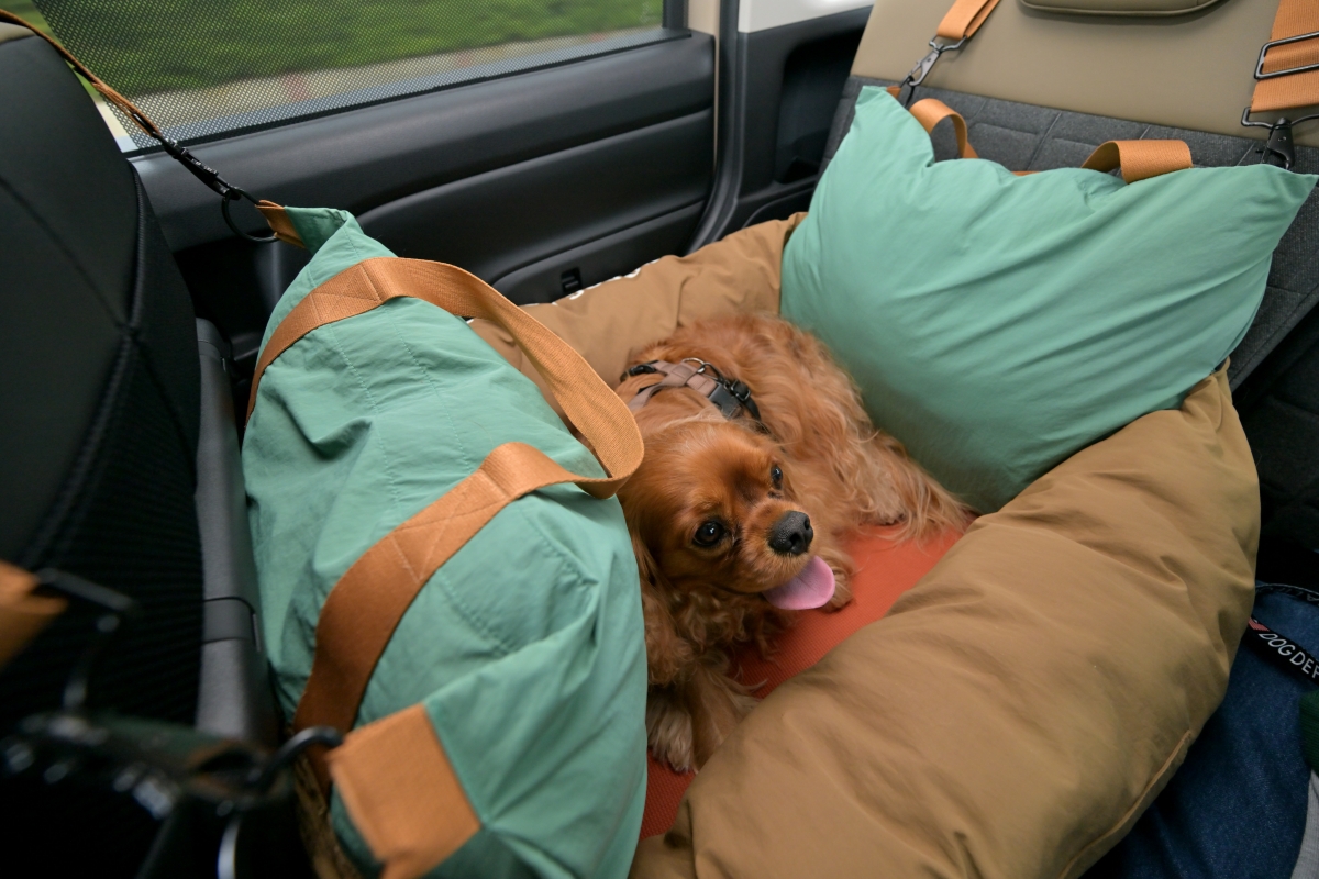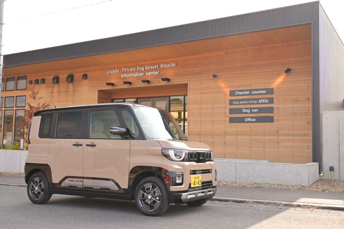 まずはここ、グランデプライベートドッグリゾート常陸まで、一般道、高速道路をドライブしてきて感じられた、新型デリカミニのクラスを超えた乗り心地の良さわん。後席のシートもフカフカで心地よく、スムーズで段差などを乗り越えてもショックは最小限。さらに前後左右の姿勢変化が少なく、車内でどこかにつかまれない犬も安心・快適なドライブを楽しめたんだよ。