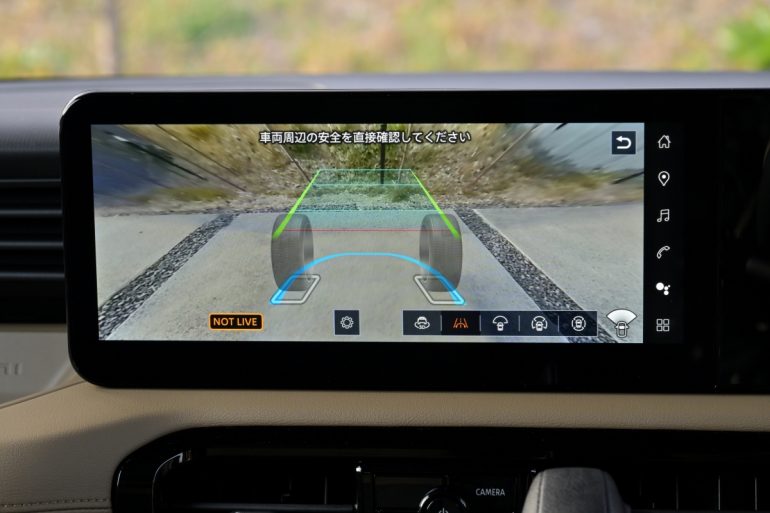 付け加えれば、1輪が完全に滑ったような場面でも、5つのモードダイヤル式ドライブモードセレクターをノーマルモードの右隣にある、砂利道や未舗装路、豪雨の際のトラクション性能を高め、加速時やコーナリング時の高い安定性を実現するグラベルモードにセットするだけで、すんなりと走破できることを実は経験済み。また、極狭の道でも移動物検知機能まである3Dマルチアラウンドモニターのスイッチを押せば、左右のクリアランスを確認することも可能。この安心感、安全性は絶大です!!