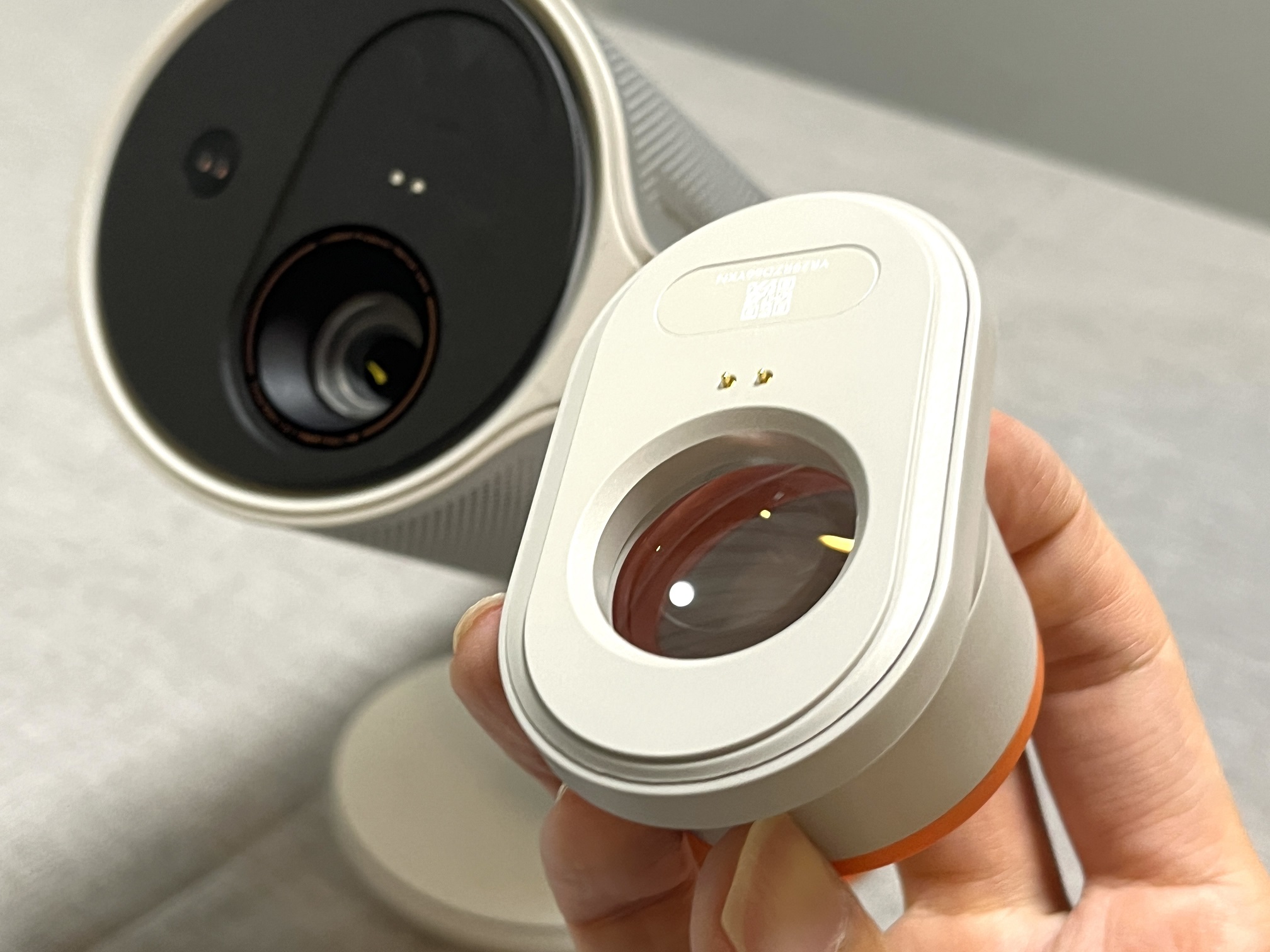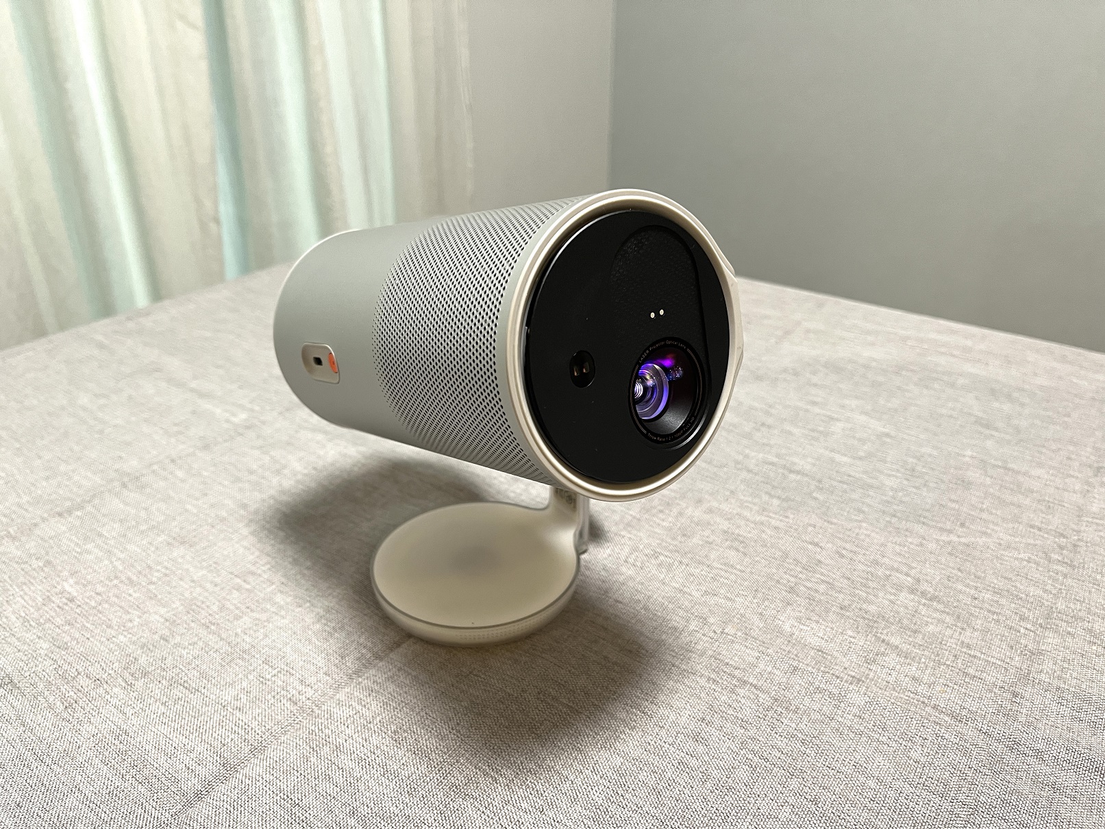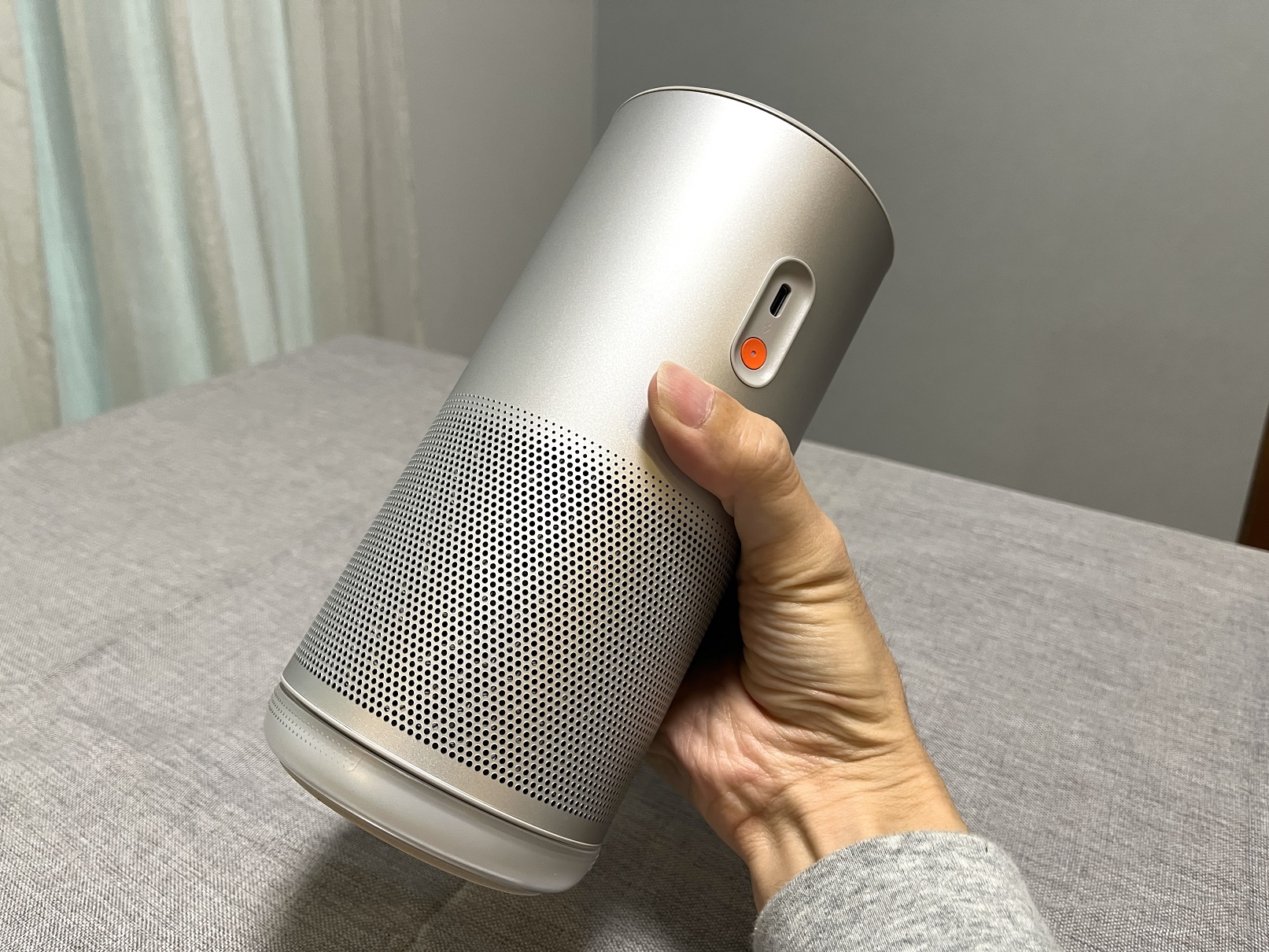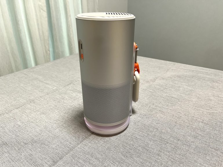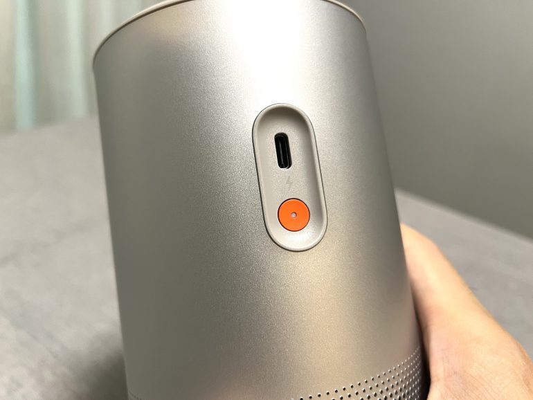 本製品は大容量バッテリー搭載により、映像投影時は最大約2.5時間、音楽再生では最大約6時間利用できるとのこと。リビングから寝室、ベランダまで持ち運んで使用したり、キャンプで映画鑑賞を行ったりと、電源の有無に左右されない自由な使用が可能となっている。オレンジ色のボタンが電源ボタンで、その上にあるUSB Type-Cコネクタから本体への給電を実施する。