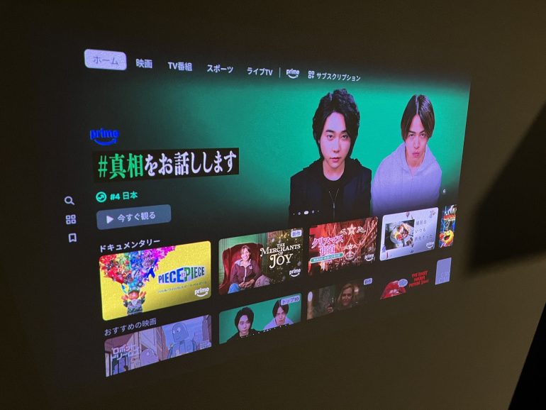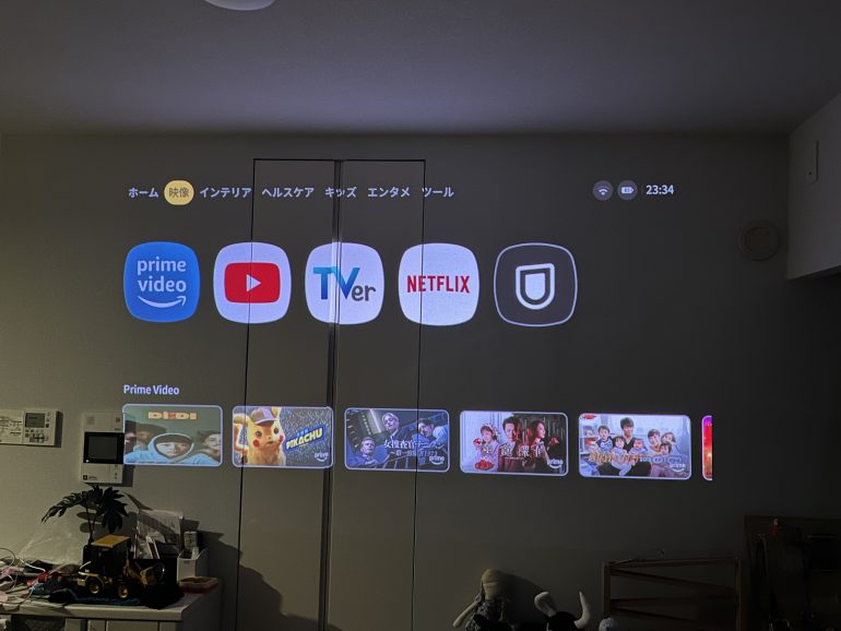 そのおかげで就寝前に横になったまま映画を楽しむといった新しい鑑賞スタイルが実現する。また、縦横方向の自動リアルタイム台形補正により、設置位置が映写場所に対して正面でない場合も映像が自然な形に補正されるため、より設置する場所に幅が持たせられる。もちろん、初めてプロジェクターを扱う人にとっても優しい設計と言える。投影する画面はコンパクトに使用するのでも良いが、やはり長く投影して大画面にするとその迫力と没入感はスマホの画面とは比べ物にならない。