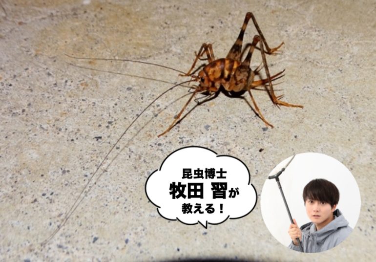 次に紹介するのはカマド“ウマ”です。カマドウマとはバッタ目カマドウマ科に属する仲間のことで、肌色や焦げ茶色などの模様を持ち、長い後ろ脚と触覚、翅を持たないことなどが特徴です。飛び跳ねる力が強いことから、馬を連想させ、古くは竈(かまど)の周りでよく見られたことからこの名前が付けられました。その独特な動きとイメージから昆虫好きの間でも「ゴキブリは大丈夫だけど、カマドウマだけは苦手」という人も多く、時には便所コオロギなどと呼ばれることもあります。