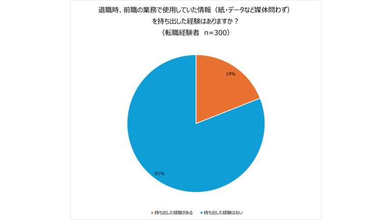 「退職時、前職の業務で使用していた情報(紙・データなど媒体問わず)を持ち出した経験はありますか?」という質問に対して、19%の転職者があると回答した。この割合は、アンケート対象者300名のうち57人にあたり、転職者の約5人に1人が情報を持ち出した経験があるという結果となった。