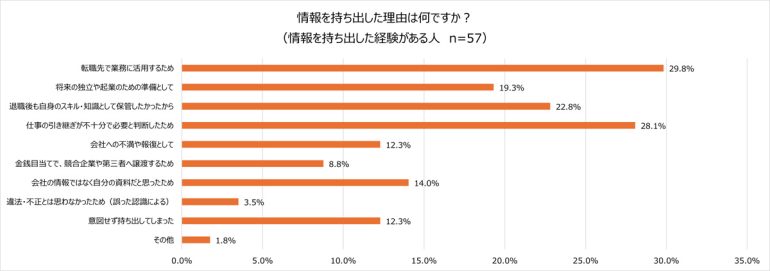 「情報を持ち出した理由は何ですか?」という質問に対しては、「転職先で業務に活用するため」が29.8%で最多の回答となっており、次いで「仕事の引き継ぎが不十分で必要と判断したため」が28.1%となった。対照的に、「違法・不正とは思わなかったため(誤った認識による)」が3.51%で最少となった。