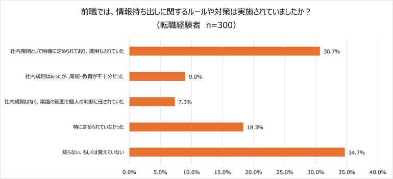 「前職では、情報持ち出しに関するルールや対策は実施されていましたか?」という質問に対しては、「知らない、もしくは覚えていない」という回答が34.7%で最多となった。
