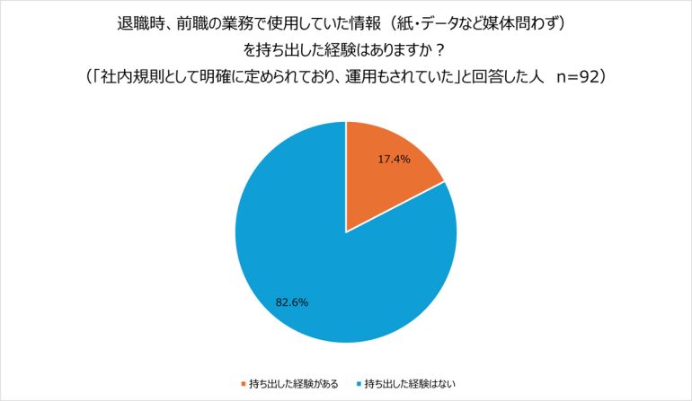 社内規則として明確に定められており、運用もされていた」と回答した人の内訳を見ると、17.4%の人が情報を持ち出した経験があると回答しており、社内規則が定められている企業においても、情報持ち出しが発生していることがわかる。