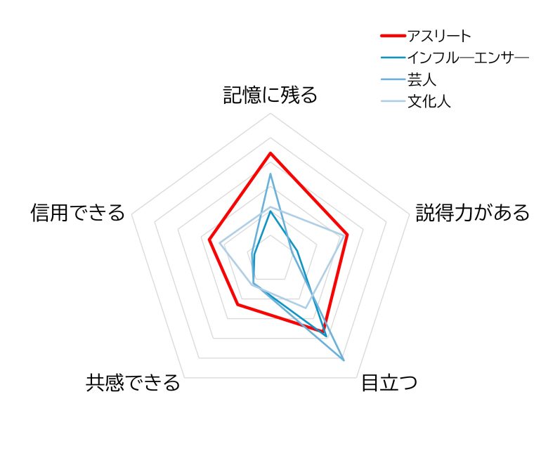 「目立つ」では芸人、インフルエンサーに次いだ数値となったものの、「記憶に残る」「説得力がある」「信用できる」「共感できる」印象はアスリート出演のCMが最も高く、視聴者にポジティブな印象を持って受け止められていることがわかる。