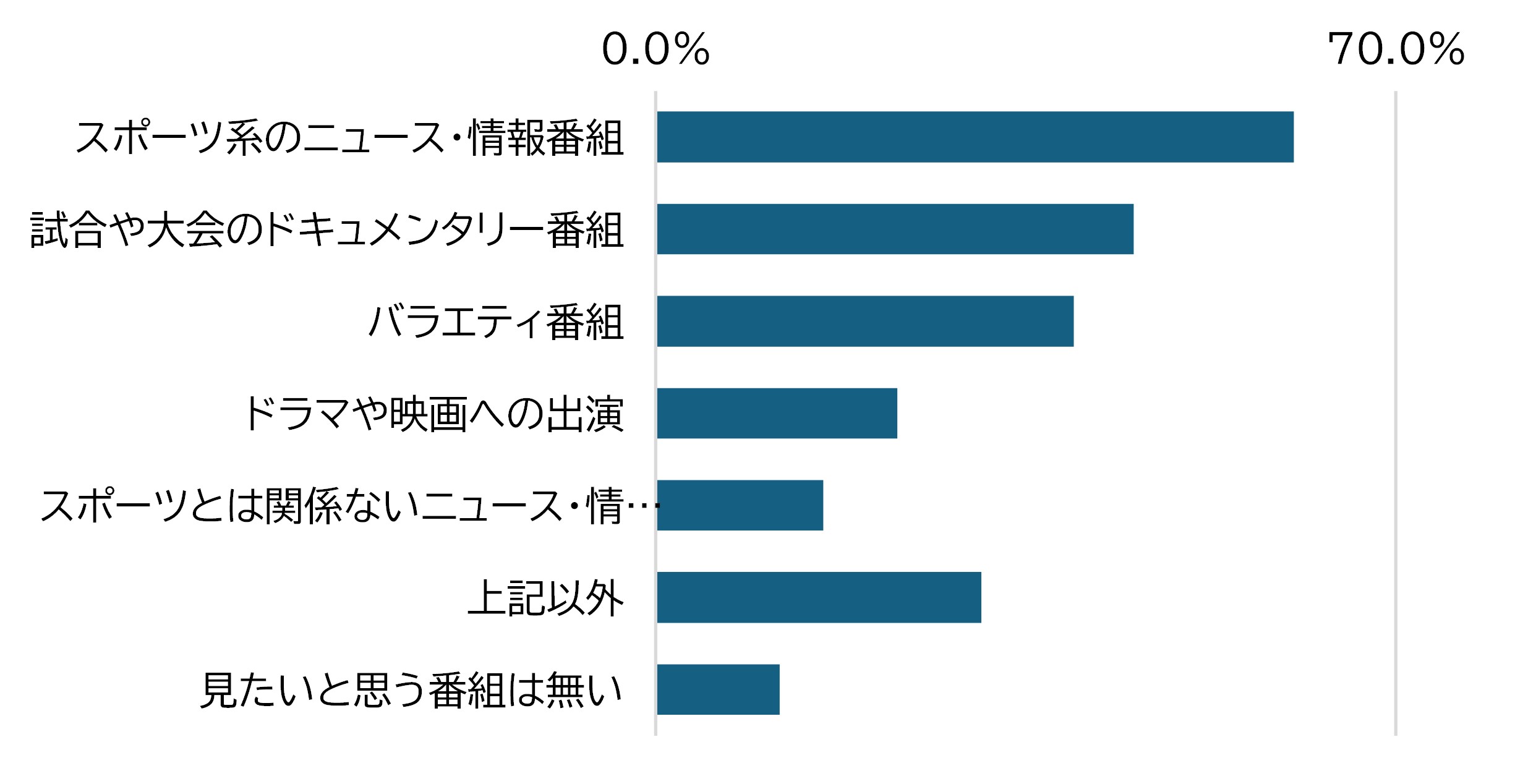 アスリートたちに出演してもらいたい番組としては、「スポーツ系のニュース・情報番組」が最多、次いで「試合や大会のドキュメンタリー番組」となった。また3番目多かったのは「バラエティ番組」で、競技中に見せる真剣な表情とは異なるアスリートの意外な一面を見たいと考える人も多いようだ。