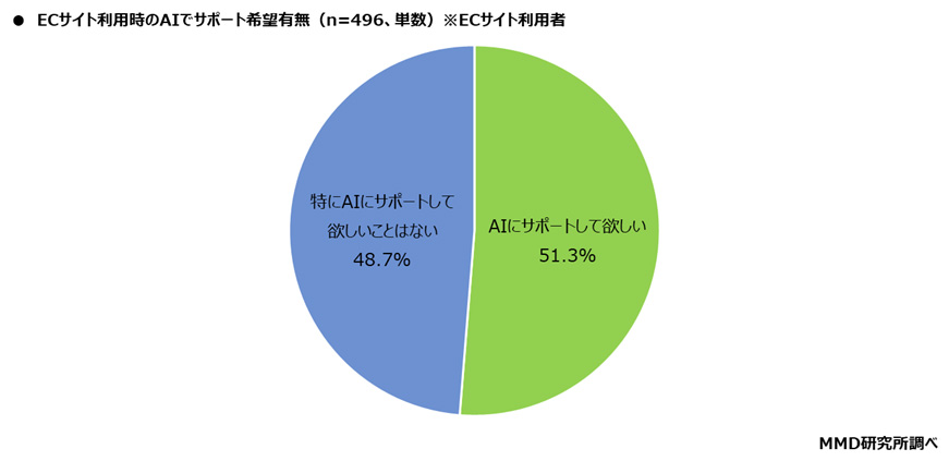ECサイト利用者496人を対象に、ECサイト利用時にAIでサポートして欲しいか聞いたところ、「AIにサポートして欲しい」が51.3%、「特にAIにサポートして欲しいことはない」が48.7%となった。