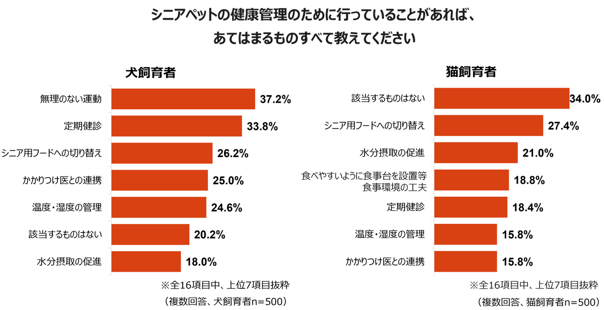 シニアペットの健康管理では、犬は「無理のない運動」(37.2%)や「定期健診」(33.8%)が上位に挙がり、健康維持のための習慣的なケアが重視されていることがわかる。