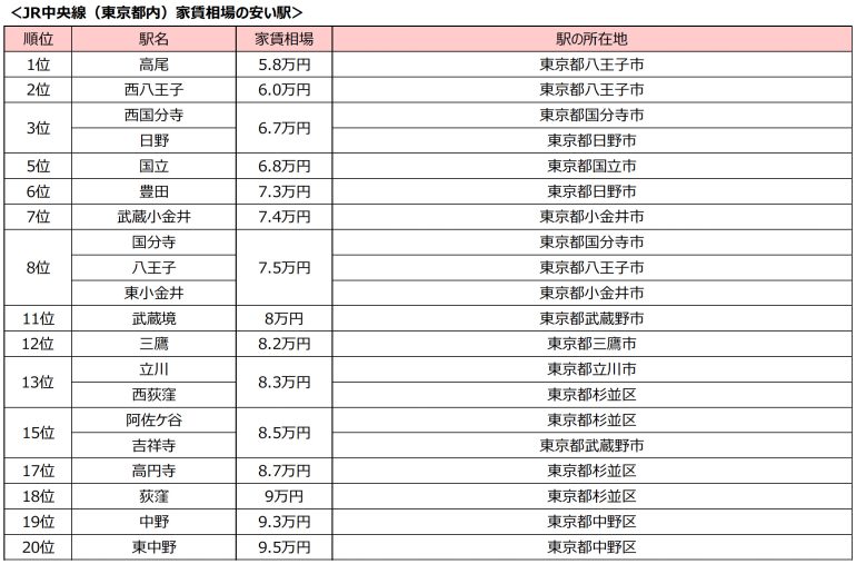 東京駅から高尾駅まで、東京の東西を結ぶJR中央線。同鉄道路線において、もっともシングル向け賃貸物件の家賃相場が安い駅はいったいどこか?
