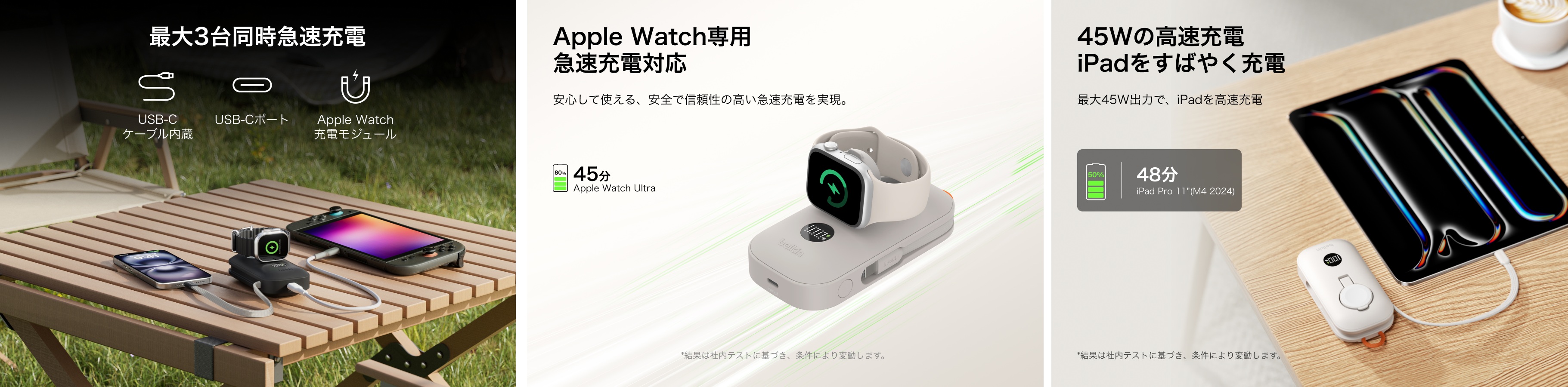 最大3台のデバイスを同時に充電!ベルキンからApple Watchの充電モジュールとUSB-Cケーブルを内蔵したモバイルバッテリーが登場