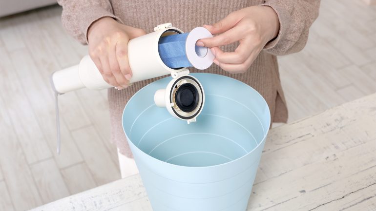 紙パック式を採用しているのも特長で、これにより、ゴミ捨ての時にホコリが舞い上がりにくく、ストレスなく衛生的に処理することが可能。紙パック内にゴミがたまるとハンドル部のゴミすてお知らせランプが点灯する機能も搭載し、交換タイミングが一目でわかる。