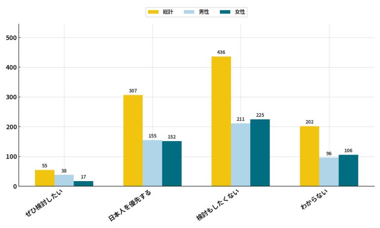 一方で「日本人を優先する」が30.7%、「わからない」が20.2%、「ぜひ検討したい」が5.5%という結果となった。全体として、明確な拒否が最多であり、前向きな受け入れよりも”条件付きの慎重姿勢”が主流であることがわかる。