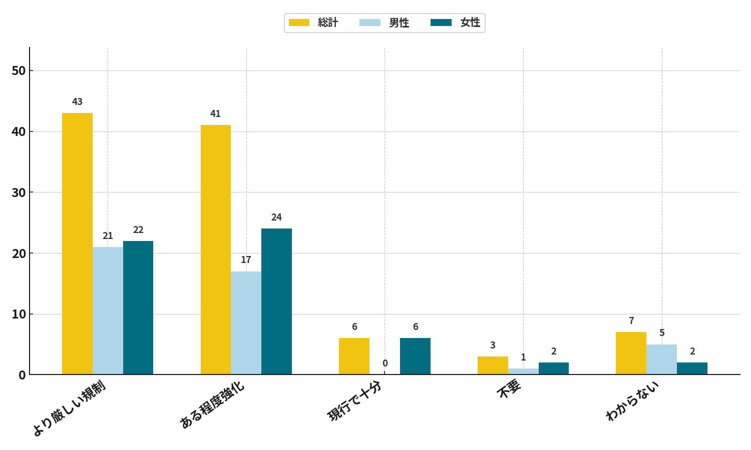 一方で「現行の規制で十分」は6%、「規制は不要」は3%にとどまり、「わからない」は7%という結果となった。全体として、外国人による空き家取得に対して、自治体による規制を強化すべきだと考える意識が明確に表れている。