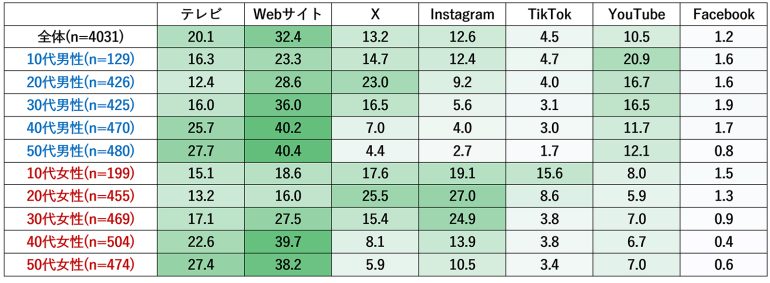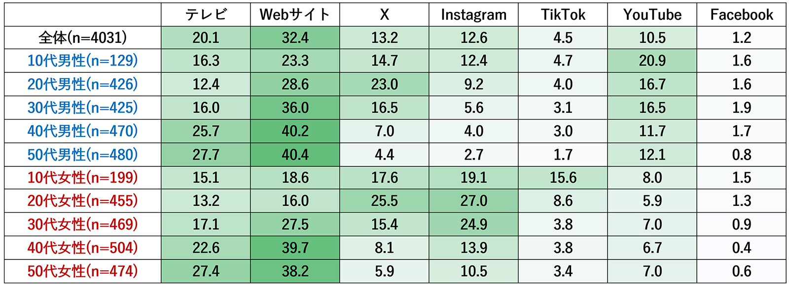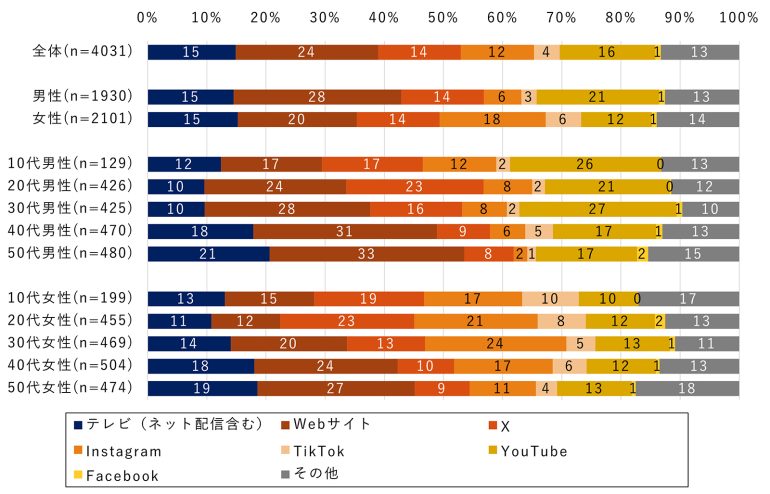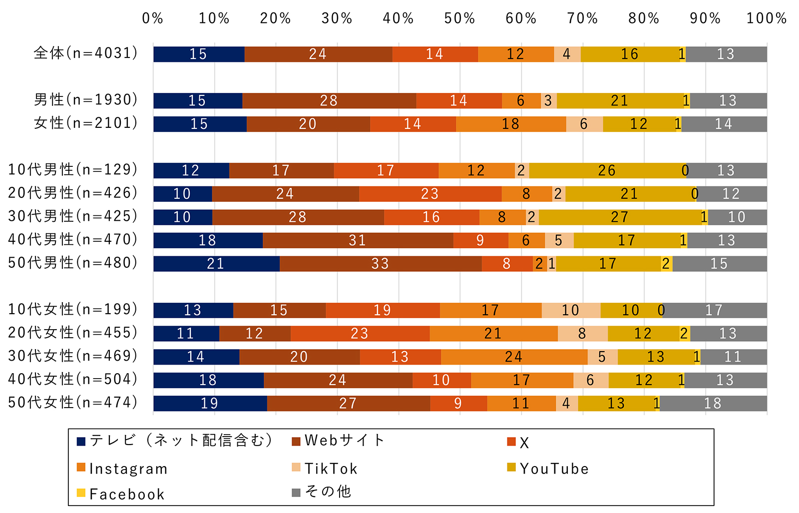 性・年代別では、男性は10代から50代の全年代で『YouTube』がもっとも高く、男性の10代から30代では4割を超えていた。10代から30代では『X』やWebサイトの割合が高く、40代から50代では「テレビ」やWebサイトも高かった。