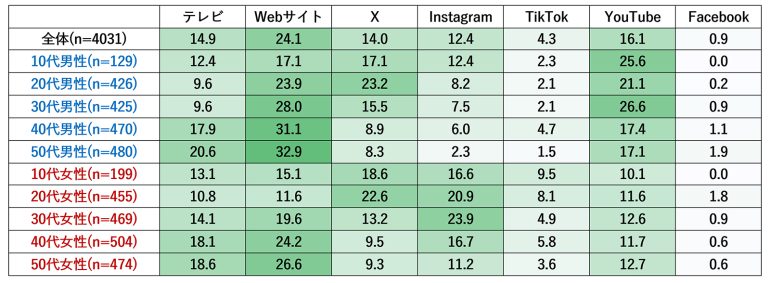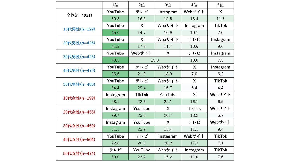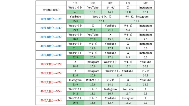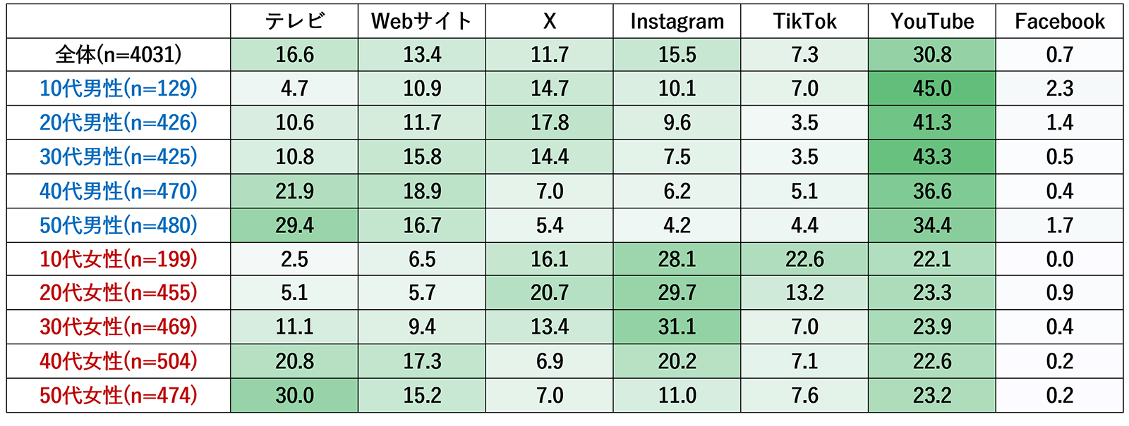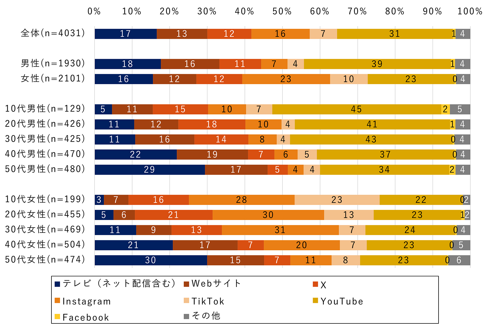 性・年代別では、男性は10代から50代の全年代で『YouTube』がもっとも高く、男性の10代から30代では4割を超えていた。10代から30代では『X』やWebサイトの割合が高く、40代から50代では「テレビ」やWebサイトも高かった。