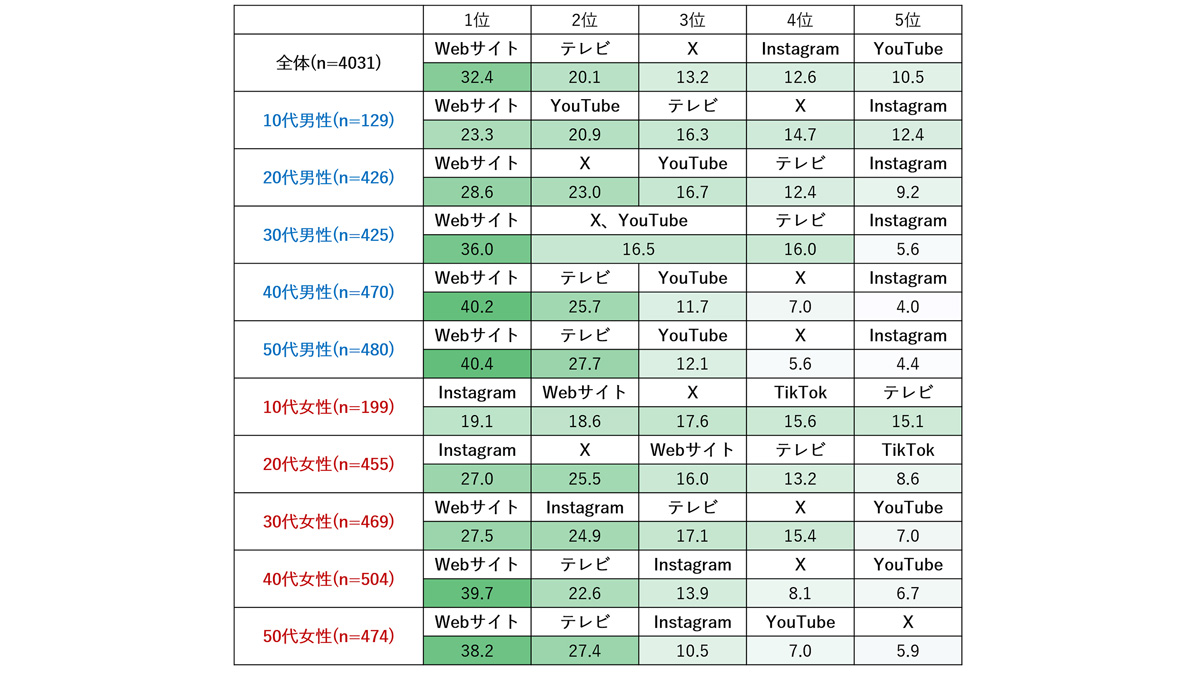 男性では、Webサイトに次いで高いのは『X』や「テレビ」、『YouTube』などだった。女性は、若年層では『Instagram』に次いでWebサイトや『X』が高く、30代以上ではWebサイトに次いで『Instagram』や「テレビ」が高かった。