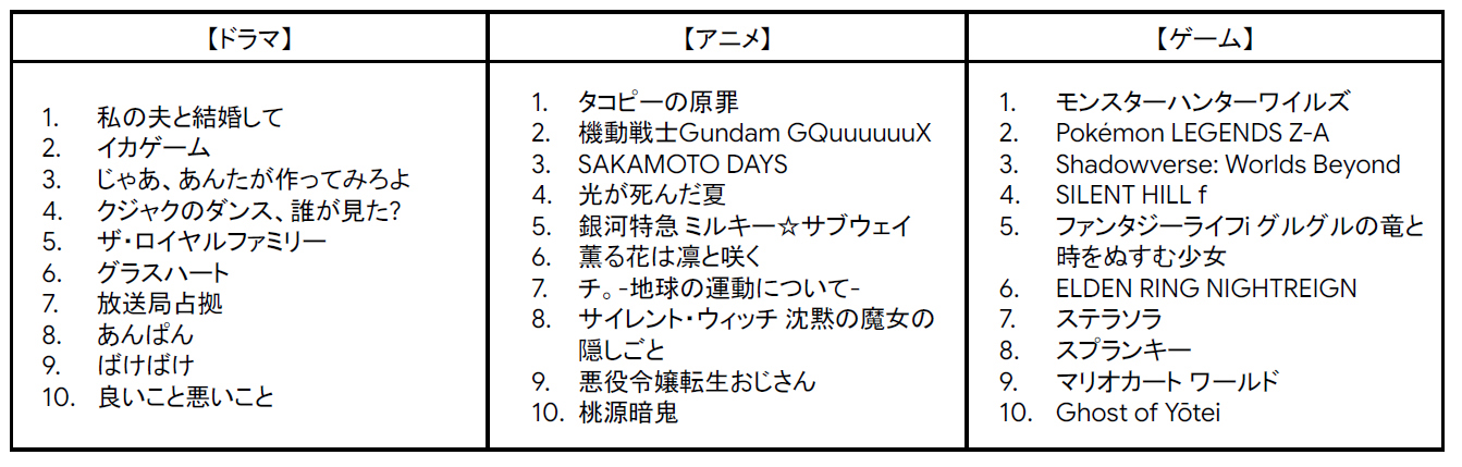 アニメでは、大きな話題を呼んだ『タコピーの原罪』が1位、2位は『機動戦士Gundam GQuuuuuuX』だった。ゲームでは、2025年2月にリリースされた『モンスターハンターワイルズ』が1位、2025年10月に世界同時発売された『Pokémon LEGENDS Z-A』が2位だった。この2作は、総合急上昇ランキングでも6位と7位にもランクインしており、注目度が高かったことが推測できる。