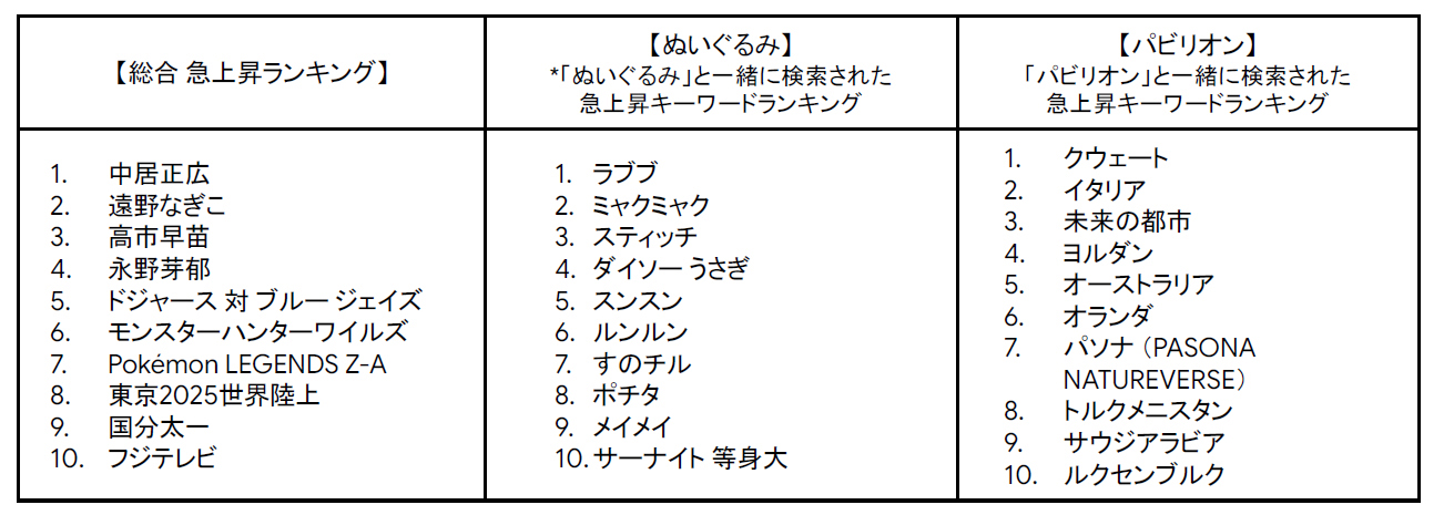 各ランキングは、2025年中にGoogle検索で昨年と比較して急上昇したキーワードで、今年の話題や流行を反映した結果になっている。