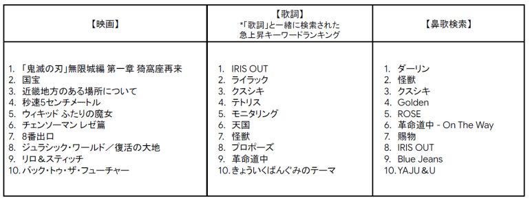 歌詞と一緒に検索された曲のランキングでは、米津玄師が『チェンソーマン レゼ篇』の主題歌として書き下ろした『IRIS OUT』が1位で、テレビアニメ『チ。-地球の運動について-』の主題歌であるサカナクションの『怪獣』が7位になるなどアニメ主題歌が注目を集めた。