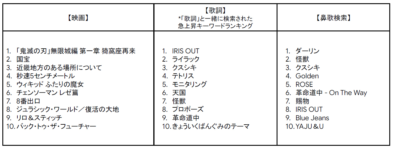 メロディーが浮かんでも曲名が分からずに検索できないときに便利な「鼻歌検索」では、 4位に『Netflix』のオリジナルアニメ映画『KPOPガールズ! デーモン・ハンターズ』の劇中歌であるHUNTR/Xの『Golden』がランクインした。「鼻歌検索」はメロディーを知っているが曲名やアーティスト名を知らない「今、耳にした」瞬間の好奇心から検索されており、「歌詞」は知っている曲名から歌詞を深く知りたいという気持ちから検索されていると思われる。
