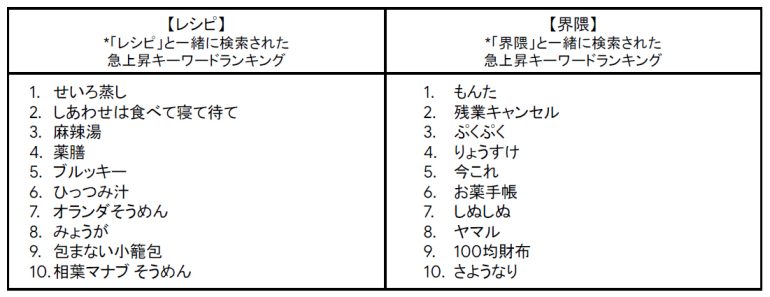 レシピでは、ヘルシー、簡単、美味しい、映えるの4拍子がそろうと話題の「せいろ蒸し」が1位だった。3位には、カスタマイズできる楽しさなど若い世代を中心にSNSで人気を集めた「麻辣湯」がランクインした。10位内には、ブラウニーとクッキーが一緒になったお菓子「ブルッキー」(5位)やテレビ番組で紹介をきっかけに注目を集めた「オランダそうめん」(7位)、「包まない小籠包」(9位)などがランクインした。