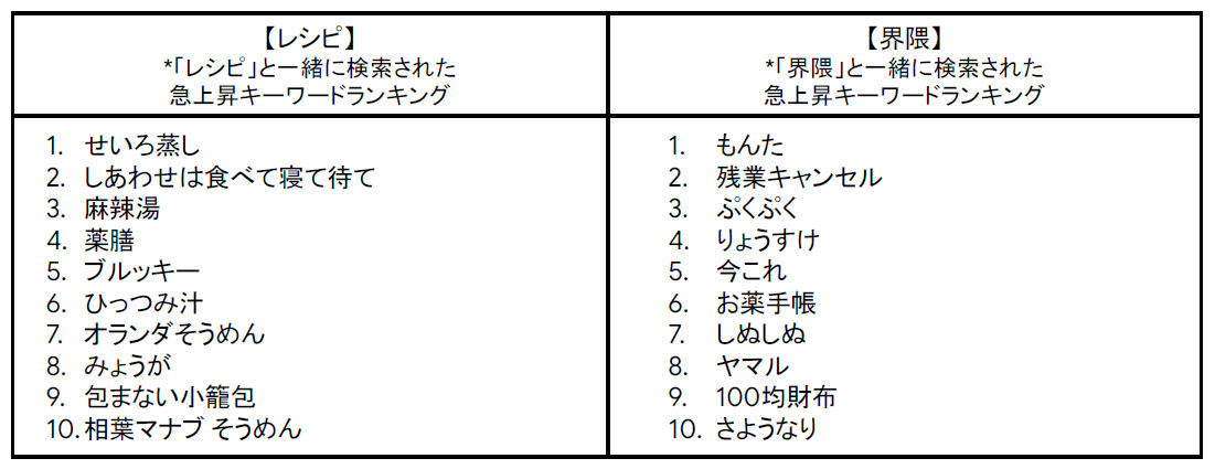 検索された急上昇キーワードは、よく見かけたものばかりだったが、今年の世相を振り返る意味ではぴったりのランキングだった。