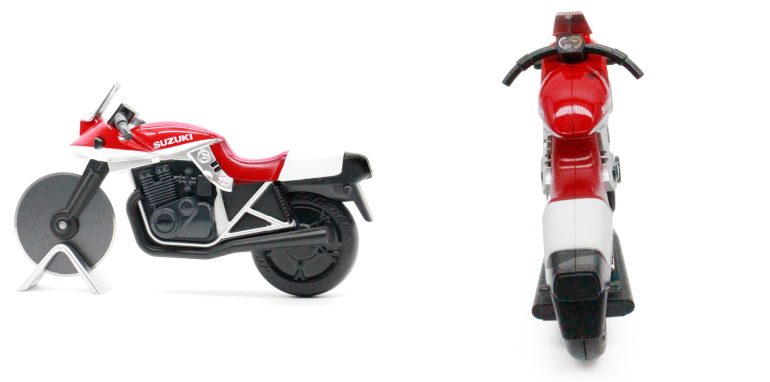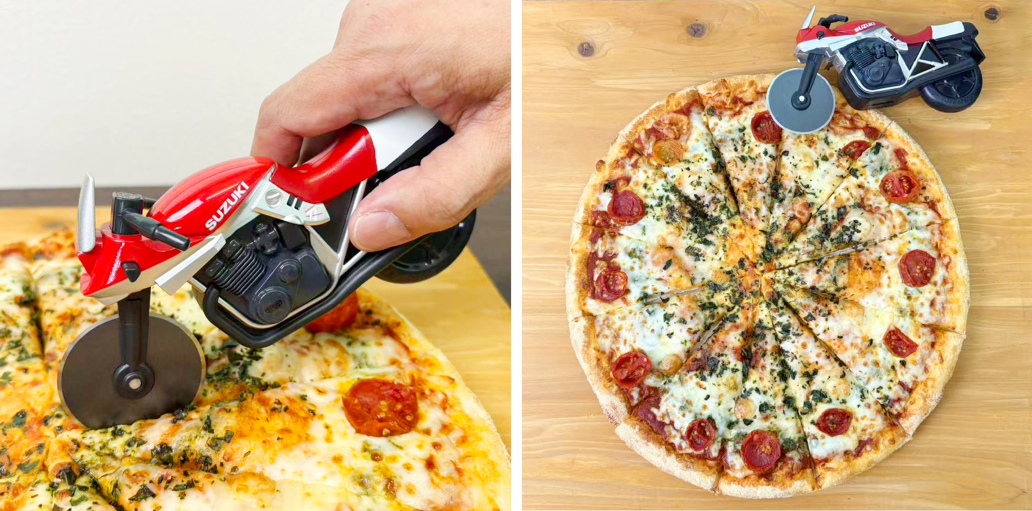 「ピザカッターナ」は、SUZUKIを象徴する名車「GSX1100S KATANA」のデザインをそのままキッチンに取り入れた人気アイテム。前輪部分がピザカッターとして機能するユニークなアイテムで、使用後は付属の専用ホルダーにセットして飾ることができる。