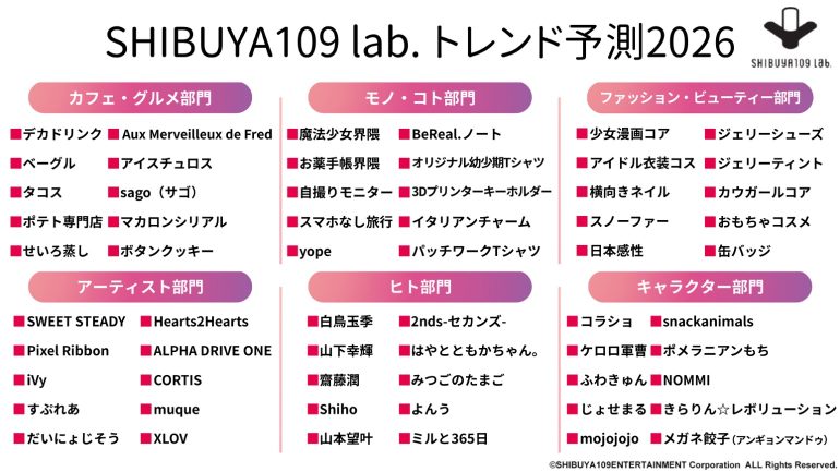 今年の『SHIBUYA109 lab.トレンド予測2026』では、キャラクター部門を新設した下記6部門でトレンドを予測している。