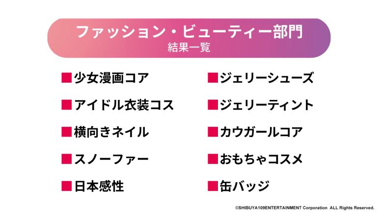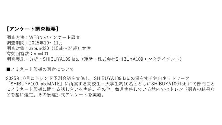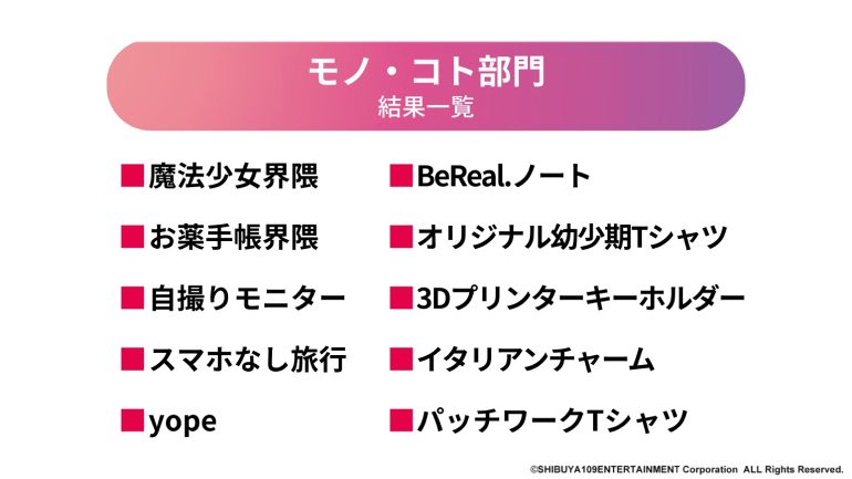 昨年発表した『SHIBUYA109 lab.トレンド予測2025』では、「ドバイチョコレート」「ぬい活」「耳つぼジュエリー・ボディジュエリー」「有線イヤホン」などを予測。Z世代が選ぶ今年のトレンドランキング『SHIBUYA109 lab.トレンド大賞2025』でも多数ノミネートされた。