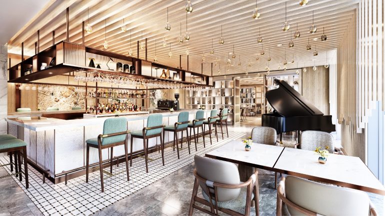 ・エントランスおよびロビーは、和の建築美を基調に、工芸やアート、書籍を配したライブラリーのような空間構成に。文化に触れ、語らいが生まれる、温かみと活気に満ちた迎賓の場とする。