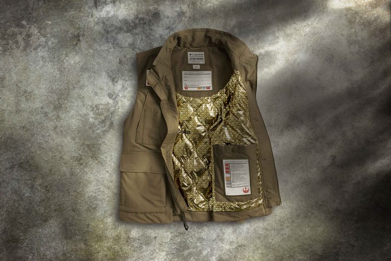 ベストは、「エンドア」の戦いで反乱軍が身につけていた戦術装備にインスパイアされたもので、本コレクション限定の反乱軍ゴールド熱反射パターンを採用したコロンビア独自の熱反射保温テクノロジー・Omni-Heat Infinityを搭載している。