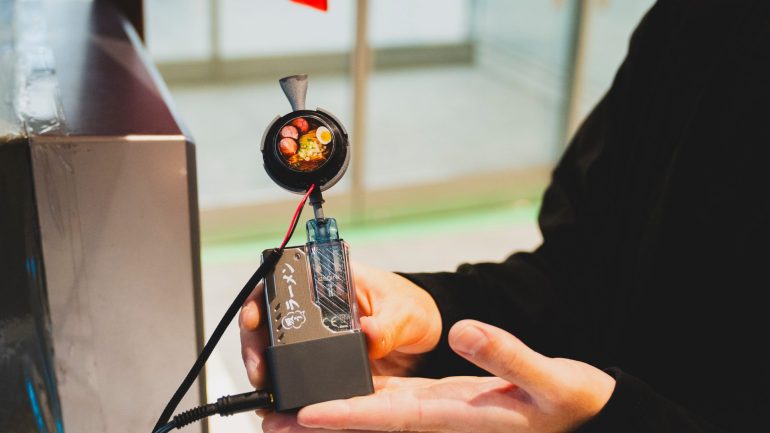 ラーメンの香りを再現したVAPEに、ラーメンをすする音や振動を連動させることで”ラーメンを擬似体験”できるプロダクト、それが「吸うラーメン」だ。開発者の一人は「健康診断の悪化を受けて、カロリーや塩分を気にしないラーメンを開発したいと思った」と語る。
