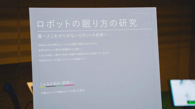 しかし、ヒトや動物を模したロボットは、実際のヒトや動物ほどの愛着を持つことはできない。なぜなのだろうか。「ロボットの眠り方の研究」は、もしかしたらその答えを提示してくれるのかもしれない。ロボットが睡眠や夢を見るという生き物のような自然な振る舞いをするようになればヒトとロボットの距離感はまた一歩前進するだろう。個人的には有名SF小説『アンドロイドは電気羊の夢見るか?』を連想し、非常に興味をそそられた。