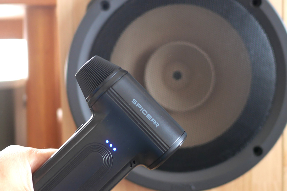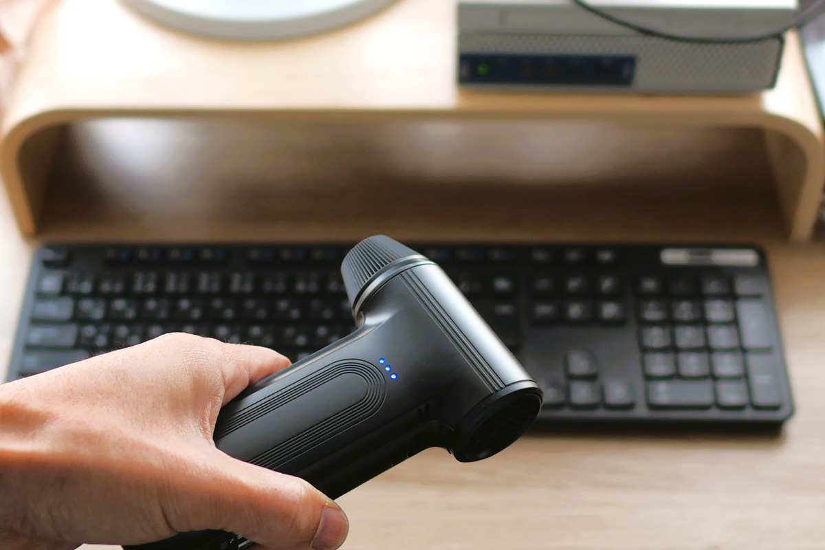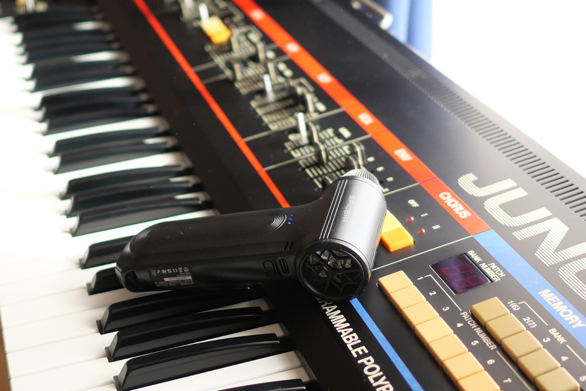 「ミニ」とはいえその風量は相当なもの。満充電してとりあえず……とデスク周りに吹いたら書類を巻き上げて(笑)しまいました! 身の回りのクリンネスを考えれば十分パワフルです。細かなチリホコリがたまりやすいパソコン回りや家電はもちろんのこと、操作ノブやスイッチが多いシンセサイザー、オーディオ類はホコリが着きやすくまたブラックフェイスであるため目立ちやすいので、効果てきめんです。