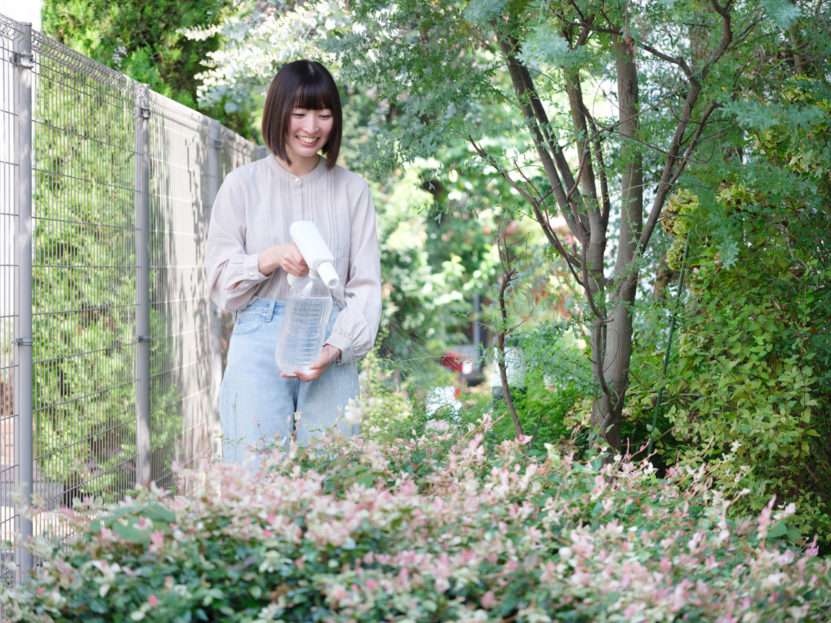 ポケッタブルという製品名通りもともとがコンパクトな上、ハンドルが折りたたみ式であるため収納にも困りません。使用時は本体に接続した給水ホース(5m)からの給水でもいいし、アタッチメント経由でペットボトルから給水すればそれこそ「コードレス」な上に「ホースレス」で小回りが利きます。