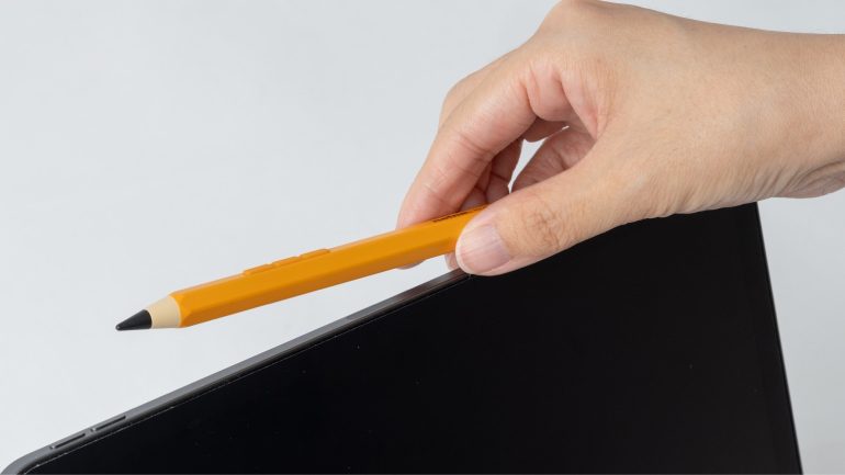 本製品は昔懐かしい鉛筆デザインに3つの物理ボタンと、9つのショートカット機能を搭載したiPad用スタイラスペン。iPad本体とマグネット吸着によるワイヤレス充電や15分の放置で電源が自動OFFなど、レトロなデザインに留まらない高性能モデルとなっている。