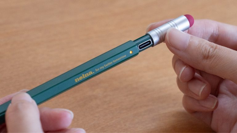 本体の後方部には、まるで本物の消しゴムのような見た目が愛らしい消しゴム型タッチペンを搭載。バッテリー残量がなくてもiPadやスマートフォンのタッチ操作が可能なほか、複数デバイスを同時に操作する際にも便利に使える。