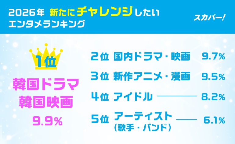 現在、“推し”といえる存在がいる方に対して、「年末年始に最もチャレンジしたい新しいエンタメジャンルを教えて下さい。」と質問したところ、「韓国ドラマ・映画(9.9%)」が1位、次いで「国内ドラマ・映画(9.7%)」、「新作アニメ・漫画(9.5%)」となり、視聴作品への関心が極めて高いことが明らかになった。