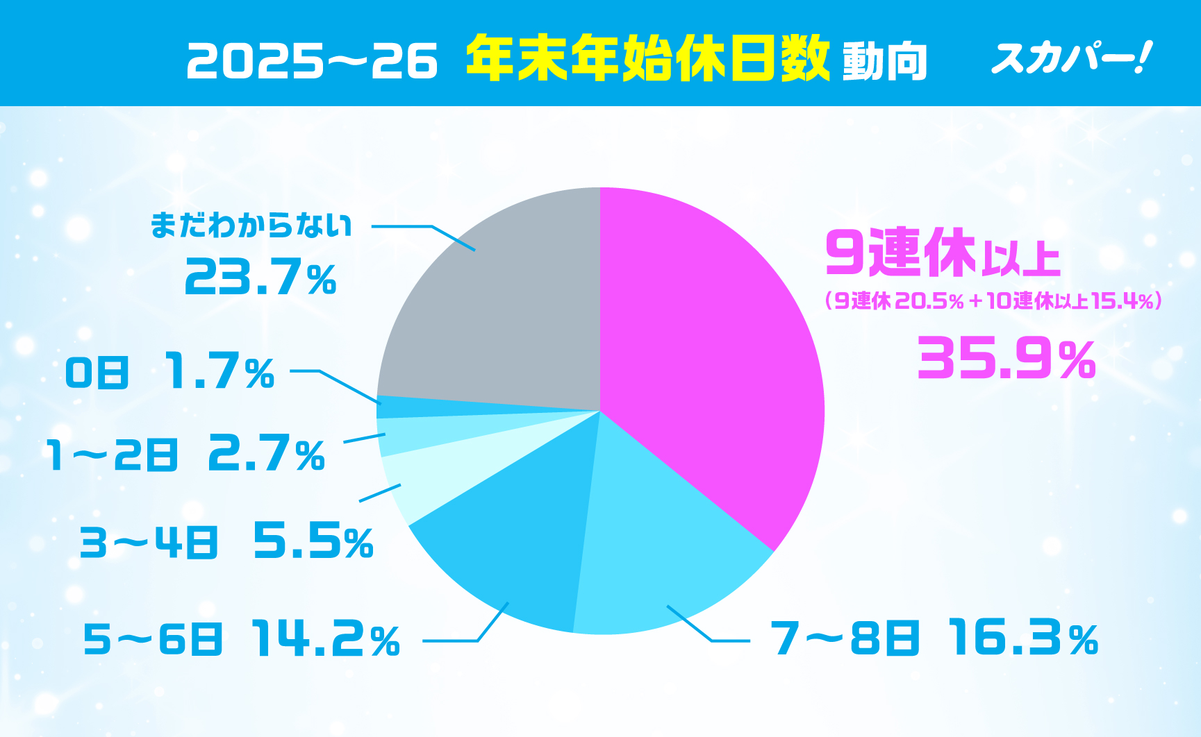 実際に、年末年始の休日日数を聞いたところ、3人に1人以上(35.9%)が「9連休+10連休以上」を取得予定であると回答。