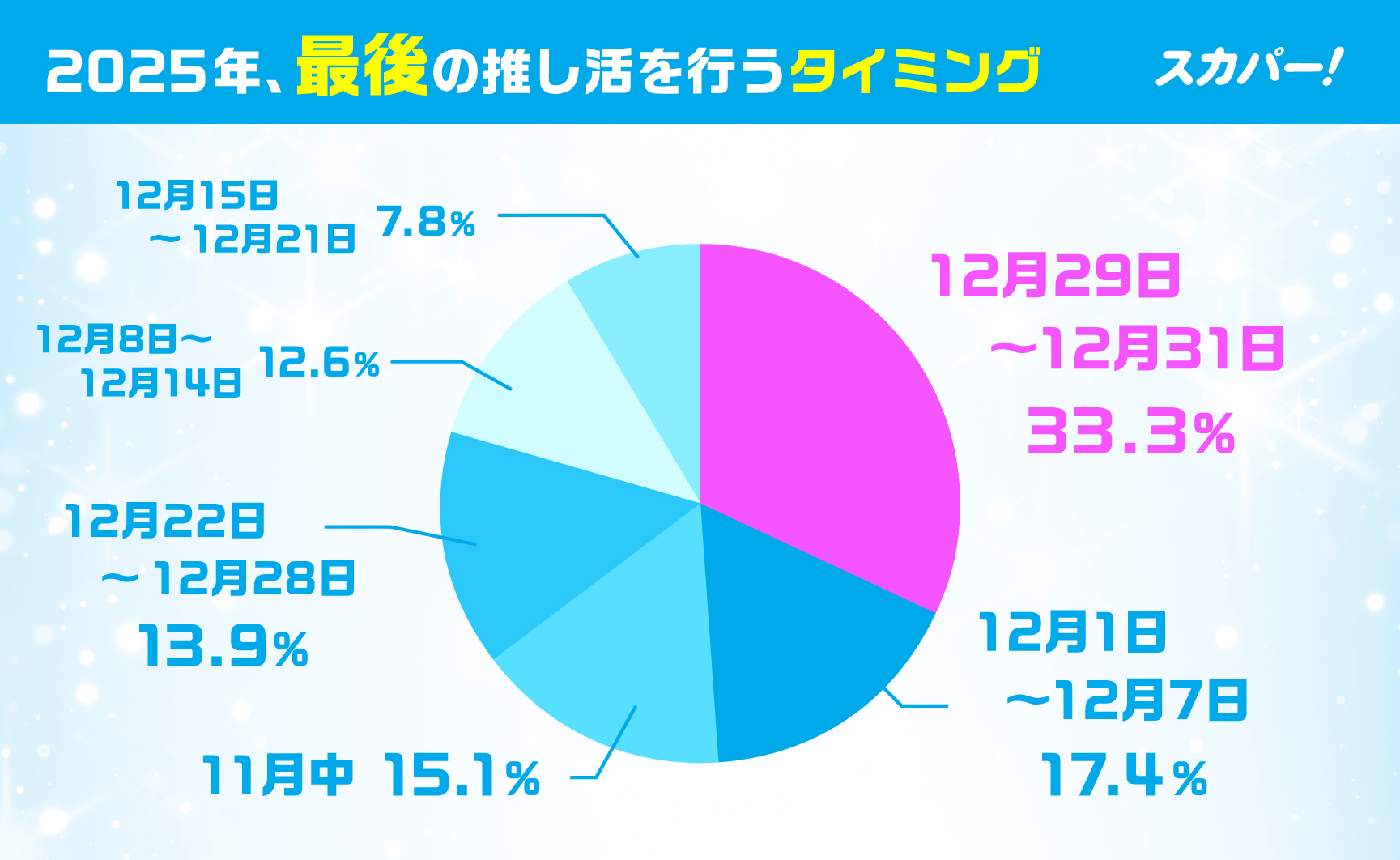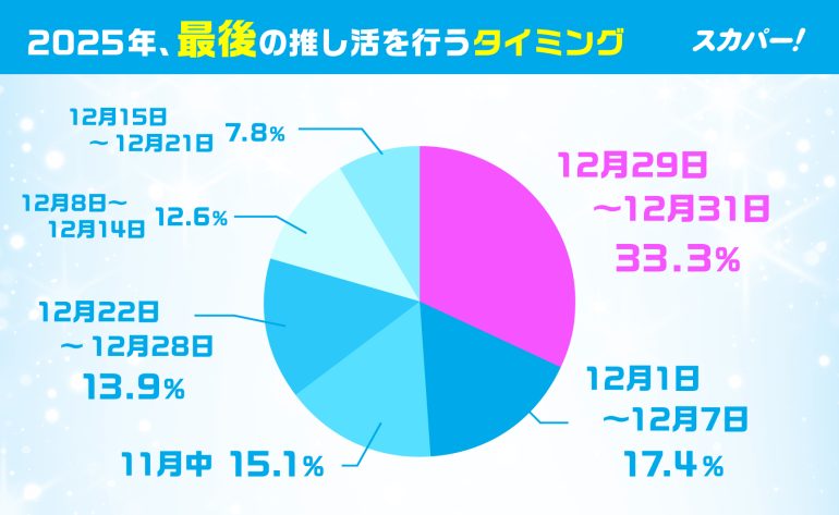 多くの人が仕事納め直後から三が日にかけての「12月29日~1月3日」に集中して推し活を行っており、年末年始の休みをフル活用して推しとの時間を楽しむ様子がうかがえる。