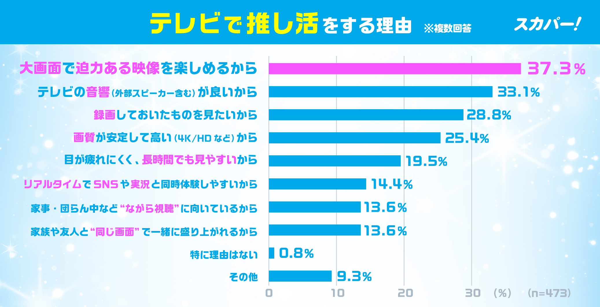 テレビ視聴と回答した人に「テレビで推し活をする理由を教えてください。」と質問したところ、「大画面で迫力ある映像を楽しめるから(37.3%)」が最多。「テレビの音響が良いから(33.1%)」も高く評価され、視聴体験の質が重視される傾向が明らかに。