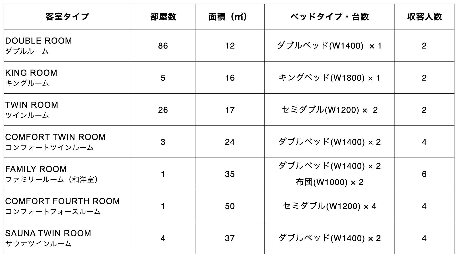 ※ファミリールーム・コンフォートフォースルーム・サウナツインルームに関しては、12月24日(水)~の予約開始となる。