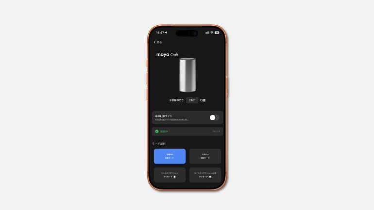 また、消費電力は最大38W、動作音は約32dbという省エネ&静音設計なのも嬉しいポイント。さらに、専用のスマートフォンアプリからの操作が可能で、部屋の広さを設定し、モードを選ぶだけで、その空間に最適化された運転がスタートする。