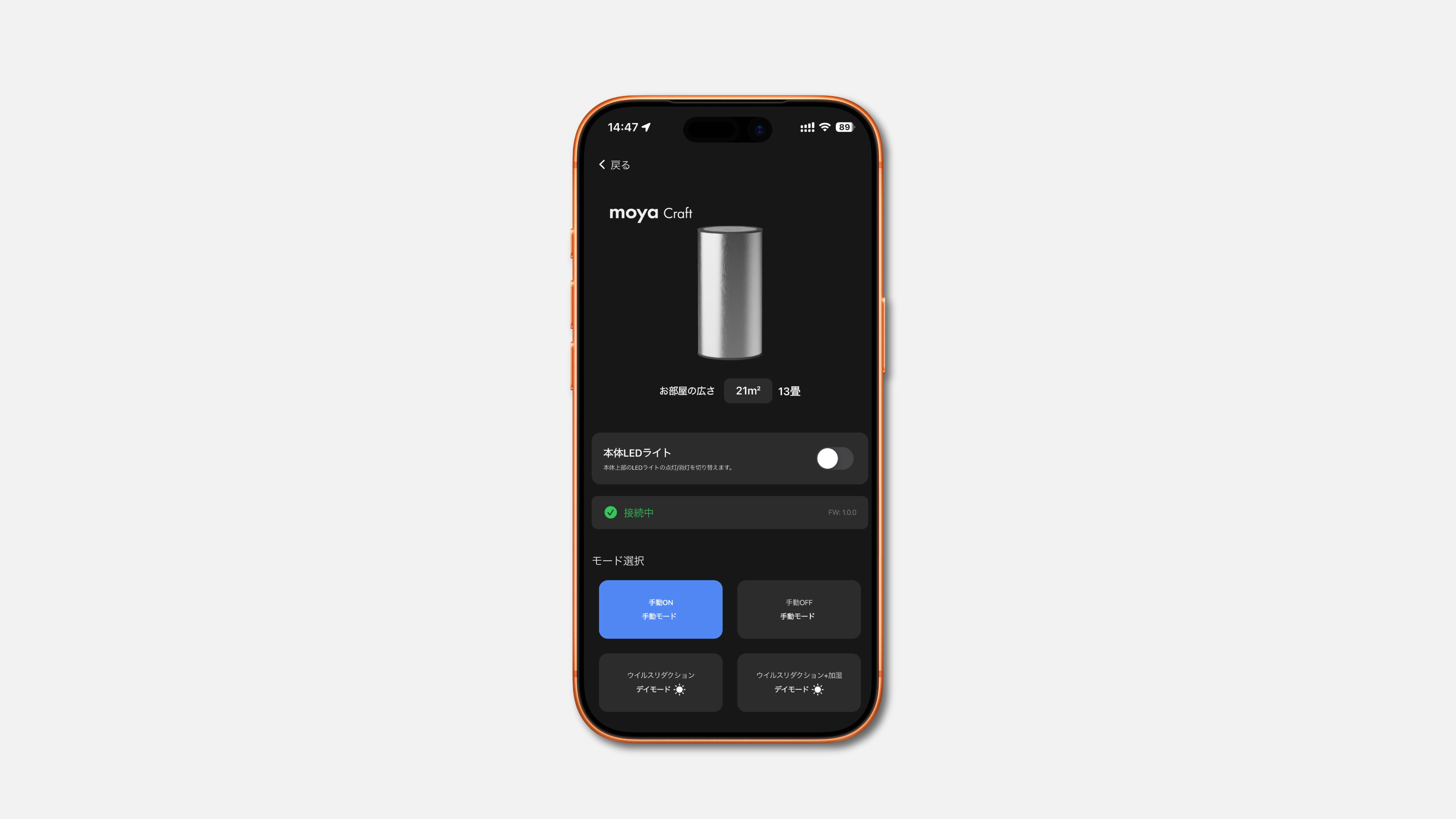 運転モード:ウイルスリダクションモード、ウイルスリダクション+加湿モード、手動モード(moyaアプリから操作可能)