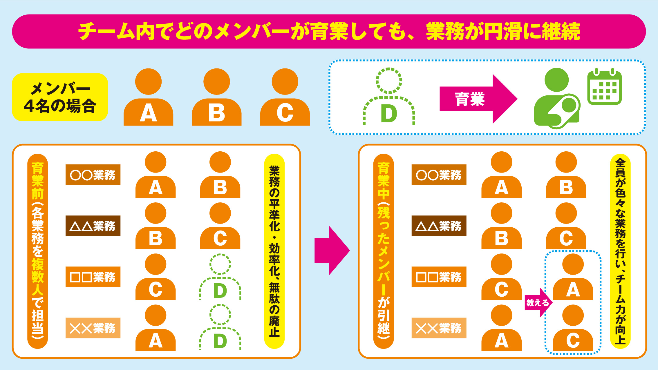 「やめる業務を決める」「〝その人頼み〟な状態は作らないようする」「全員が様々な業務をできるようにする」など、育業する人がいたからこそ掴んだヒントが、今後に生かされていくに違いない。