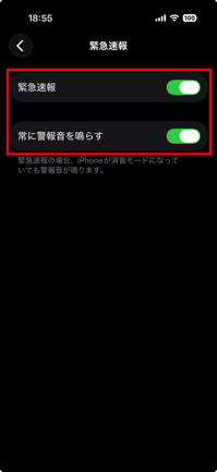 2.画面下までスクロールした後、「緊急速報」をタップ→「緊急速報」「常に警報音を鳴らす」をオン/オフする